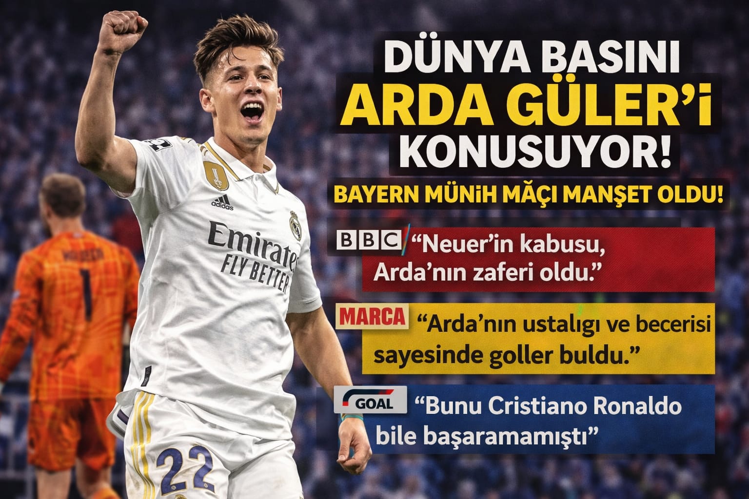 Arda Güler’in Real Madrid formasıyla Bayern Münih karşısında attığı 2 gol, sadece maçın değil, dünya futbol gündeminin de en çok konuşulan anlarından biri oldu. Genç yıldızın performansı, uluslararası basında geniş yankı uyandırdı.