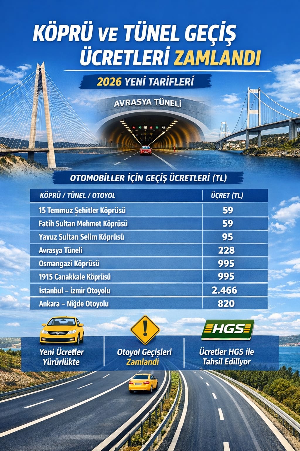 Yeni yılın başlamasıyla birlikte köprü, otoyol ve geçiş tünellerinde uygulanacak geçiş ücretleri belli oldu. Karayolları Genel Müdürlüğü ile yap-işlet-devret modeli kapsamında işletilen projelerde 1 Ocak itibarıyla yeni tarifeler yürürlüğe girdi.